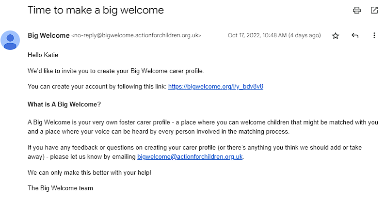 If you have any technical issues or want to share feedback, you can get in touch at: bigwelcome@actionforchildren.org.uk.
